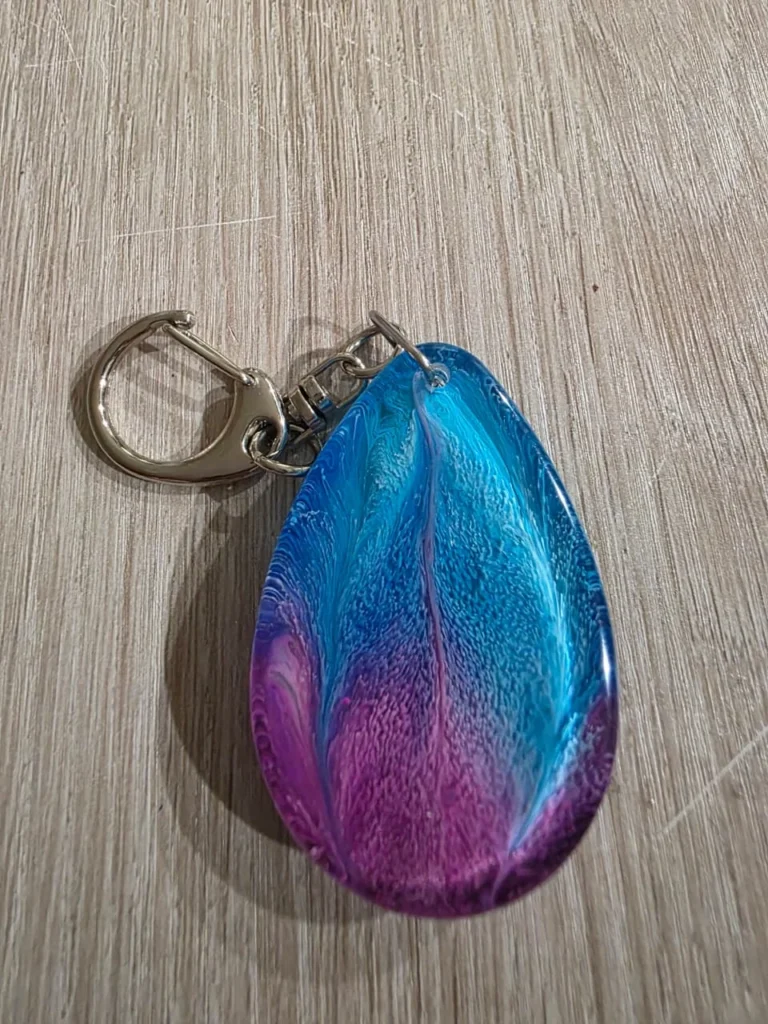 A handcrafted resin keychain named ‘Azure Bloom’, capturing swirls of color and fantasy essence, polished to perfection.