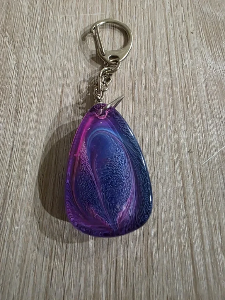 A handcrafted resin keychain named ‘Crystal Gleam’, capturing swirls of color and fantasy essence, polished to perfection.