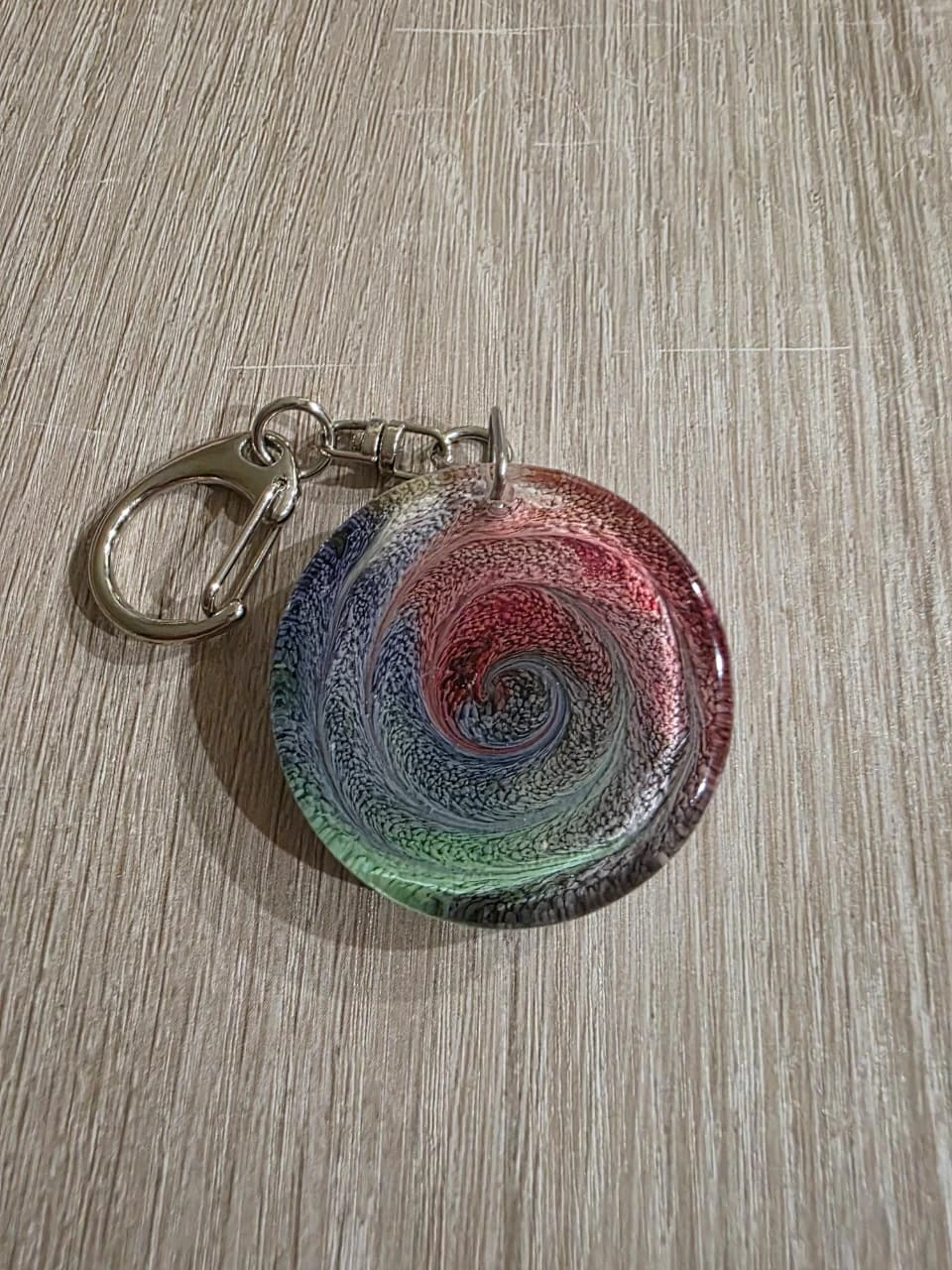 A handcrafted resin keychain named ‘Obsidian Pulse’, capturing swirls of color and fantasy essence, polished to perfection.