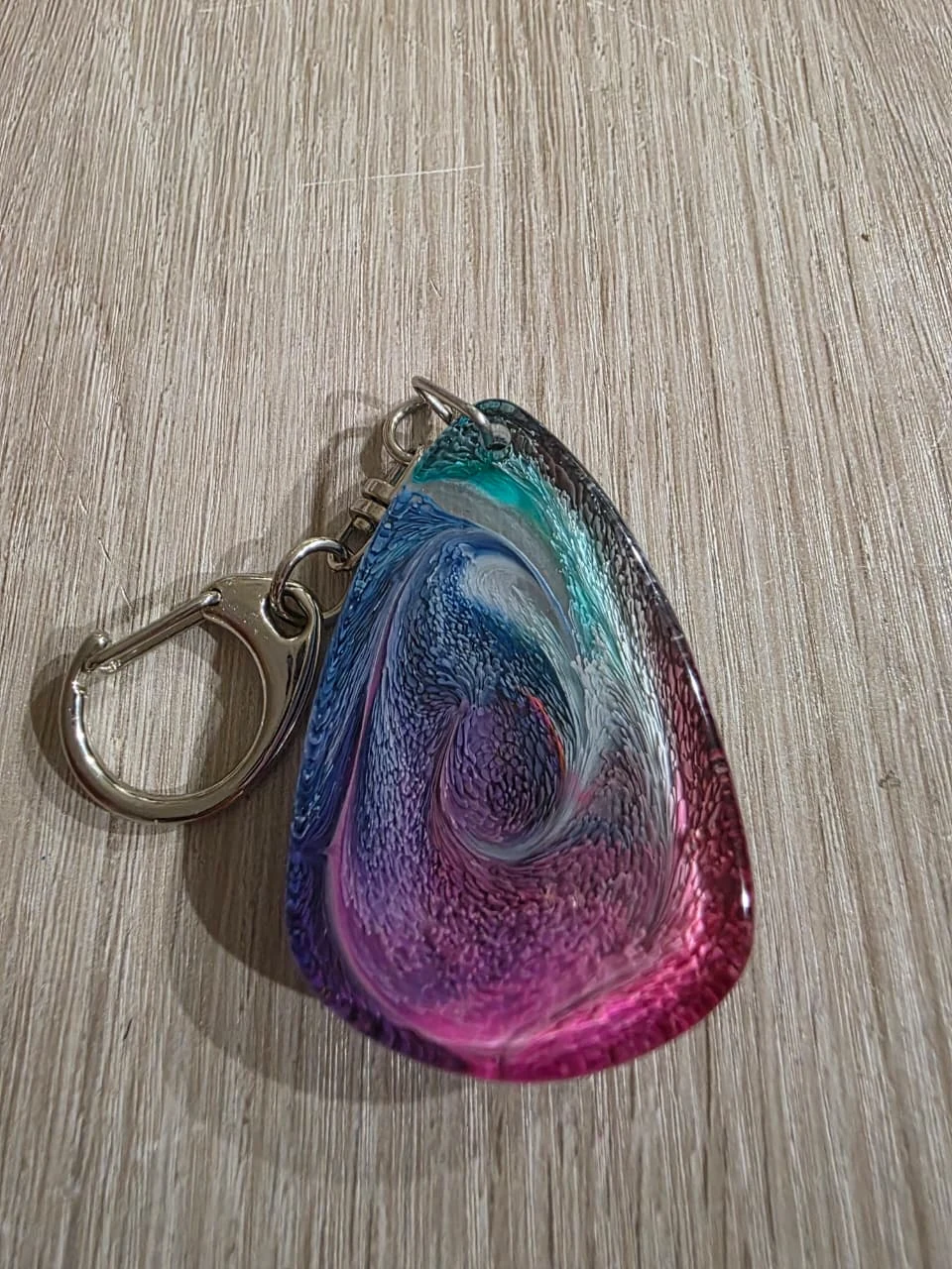 A handcrafted resin keychain named ‘Obsidian Veil’, capturing swirls of color and fantasy essence, polished to perfection.
