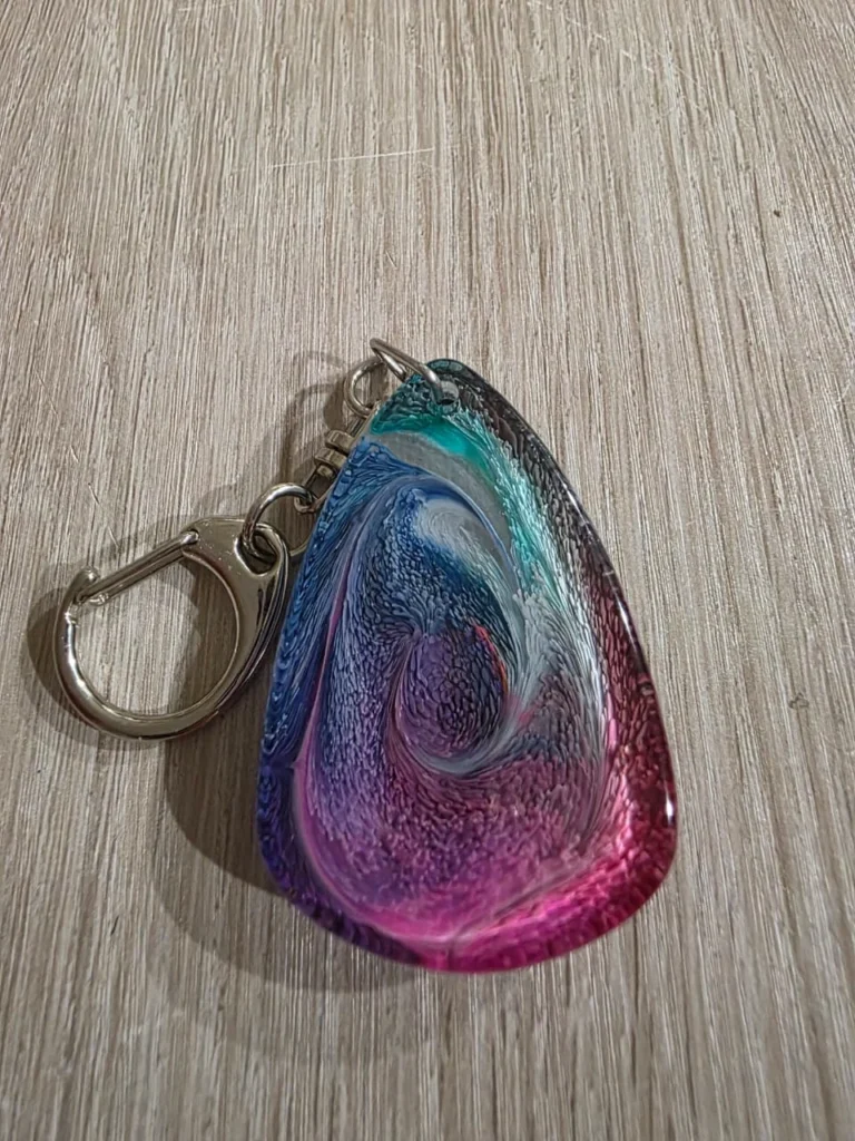 A handcrafted resin keychain named ‘Velvet Shard’, capturing swirls of color and fantasy essence, polished to perfection.